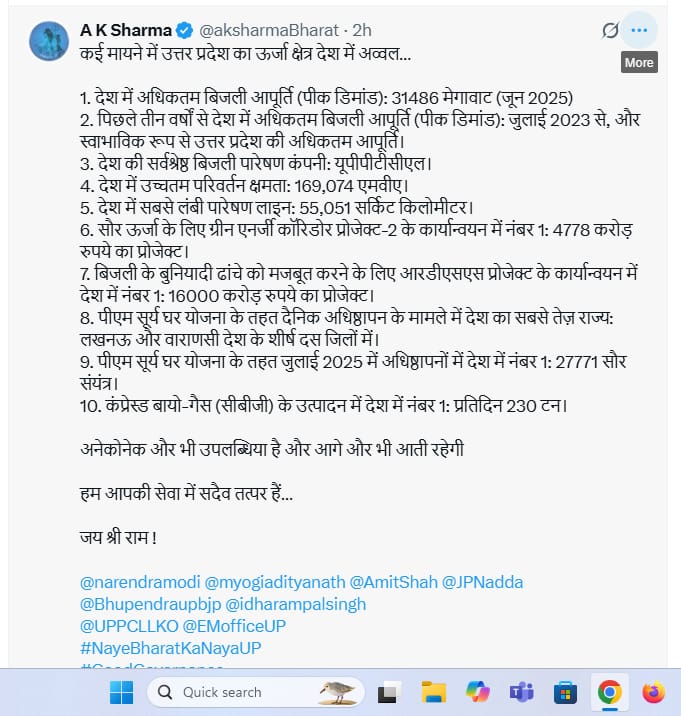 ऊर्जा मंत्री एक शर्मा जी द्वारा एक्स पर आज ट्वीट कर दर्जनों बिंदुओं पर खुलासा करते हुए कहा गया है कि कई मायने में उत्तर प्रदेश का ऊर्जा क्षेत्र देश में अव्वल है निश्चित तौर पर यह बात सही है ऊर्जा मंत्री ने कहा देश में अधिकतम बिजली आपूर्ति जून 2025 में 31486 मेगावाट बिजली के बुनियादी ढांचे को मजबूत करने के लिए आरडीएसएस प्रोजेक्ट के क्रियान्वन में देश में नंबर वन 16000 करोड रुपए का प्रोजेक्ट देश की सर्वश्रेष्ठ बिजली ट्रांसमिशन कंपनी देश में सबसे लंबी ट्रांसमिशन लाइन 55051 सर्किट किलोमीटर और देश में उच्चतम परिवर्तन क्षमता 169074 एमवीए सहित अन्य मामलों पर अपनी बात रखी गई है।