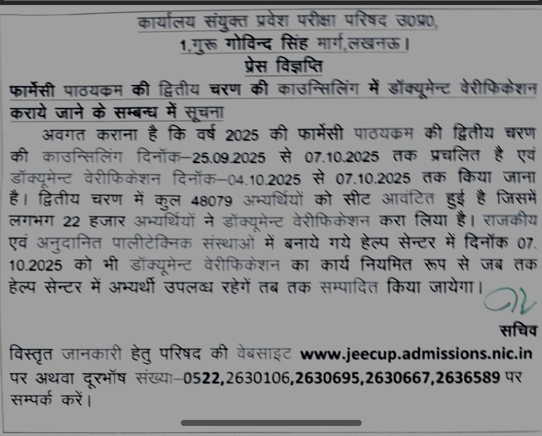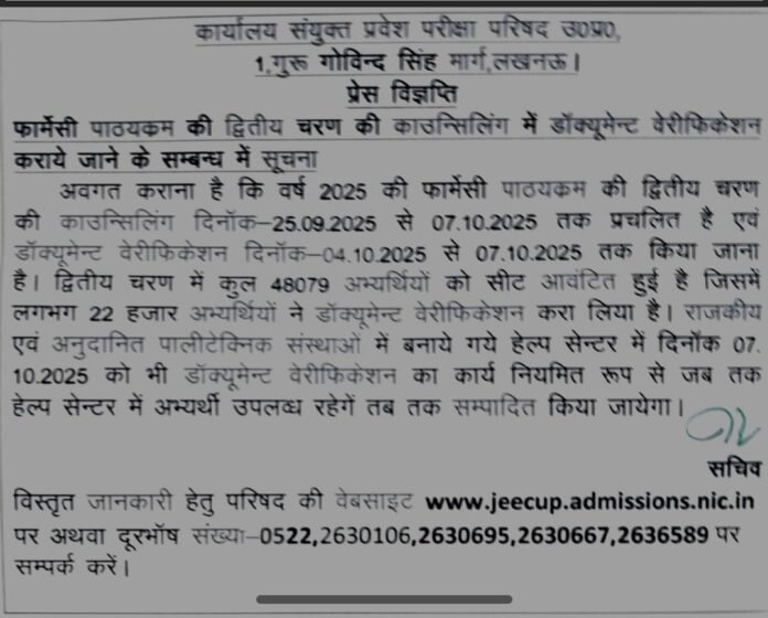 लाइव सत्यकाम न्यूज,लखनऊ : संयुक्त प्रवेश परीक्षा परिषद, उत्तर प्रदेश द्वारा वर्ष 2025 के फार्मेसी पाठ्यक्रम की द्वितीय चरण काउंसिलिंग के अंतर्गत दस्तावेज सत्यापन (Document Verification) की प्रक्रिया 7 अक्टूबर 2025 तक जारी रहेगी । परिषद के अनुसार, द्वितीय चरण की काउंसिलिंग 25 सितंबर से 7 अक्टूबर 2025 तक संचालित है, जिसमें कुल 48,079 अभ्यर्थियों को सीटें आवंटित की गई हैं। इनमें से लगभग 22,000 अभ्यर्थियों ने अपने दस्तावेजों का सत्यापन कार्य पूर्ण कर लिया है।